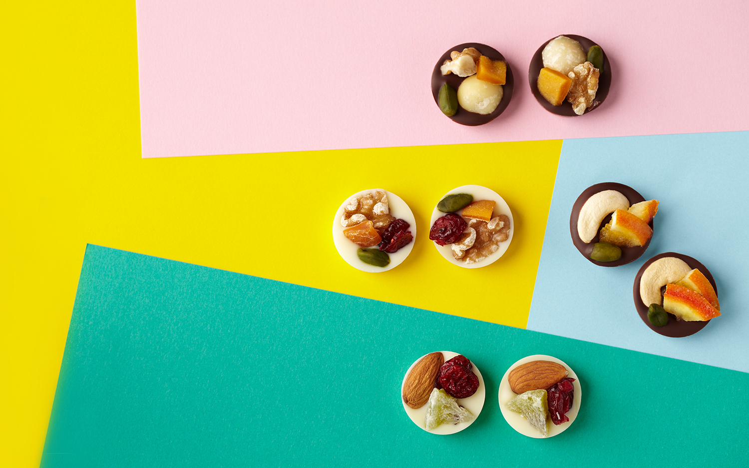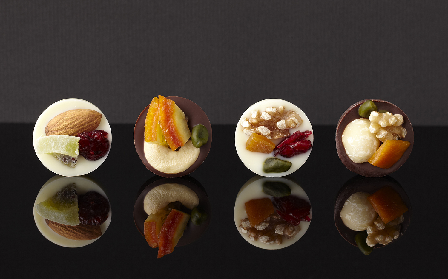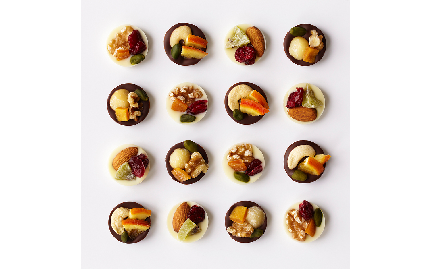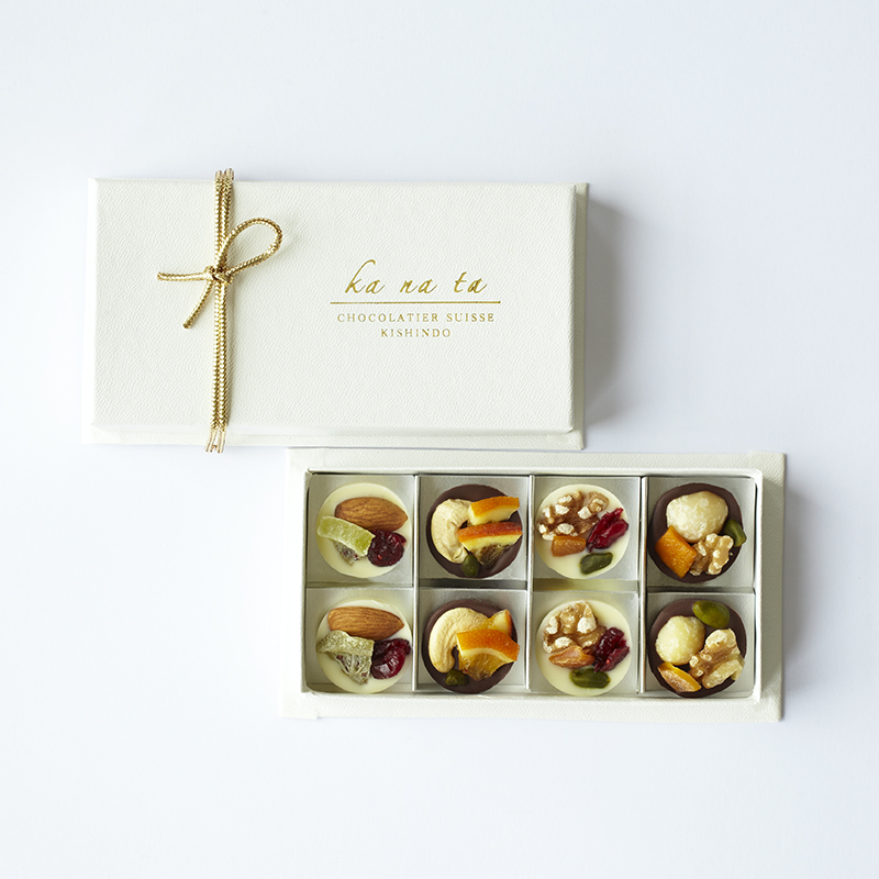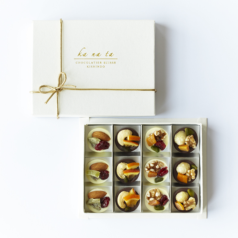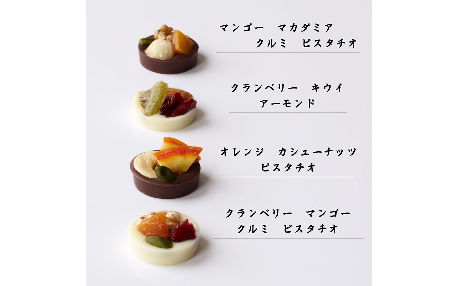 カカオの香り高いクーベルチュールチョコレートとミルクの風味が引き立つホワイトチョコレートにオレンジ、マンゴー、キウイ、クランベリーのドライフルーツとカシューナッツ、ピスタチオ、くるみ、アーモンド、マカダミアの木の実をあしらった4種類の組み合わせをご用意いたしました。